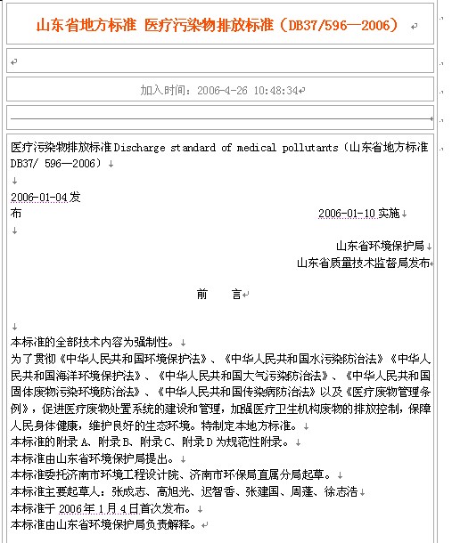 山東省地方標準 醫療污染物排放標準(DB37596—2006)