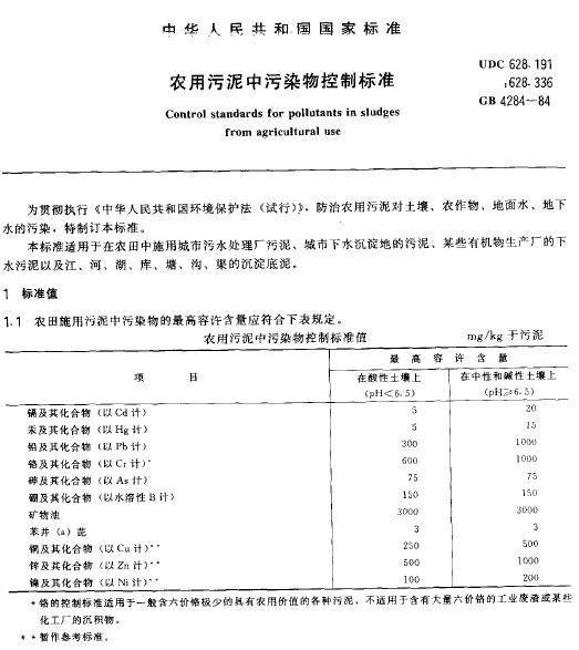農(nóng)用污泥中污染物控制標準GB 4284-84)