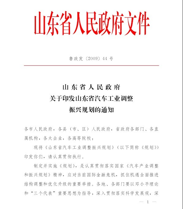 山東省汽車工業(yè)調(diào)整振興規(guī)劃 魯政發(fā)[2009]44號(hào)